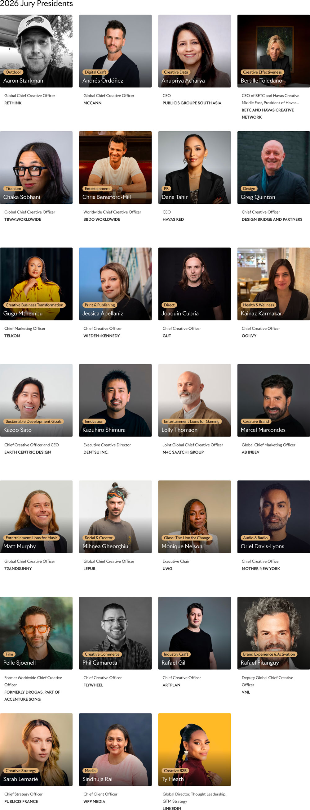 Commentant cette édition, Simon Cook, CEO de LIONS, déclare : « Nos présidents de jury sont sélectionnés pour leur leadership créatif, leur vision globale et leur capacité à reconnaître les travaux qui élèvent les standards. La sélection 2026 reflète toute l’ampleur de la créativité actuelle, de la construction de marque à la transformation, en passant par l’influence culturelle et le commerce. Je suis convaincu qu’ils établiront ensemble un nouveau standard puissant. »